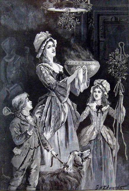 This more genteel form of "wassailing" was not nearly as raucous as when the men did it. In fact, quite the opposite: the men that ventured out to wassail (also known as mumming), were often of the working class, and they would wear garish costumes as a disguise and roam the streets making themselves known to all, or went house to house in a fashion somewhat similar to our modern Hallowe'en trick-or-treating, and they would be singing, dancing, and putting on short skits or plays, to receive food and drink. Sometimes they would demand the warm drink "in kind" from the master of the house.